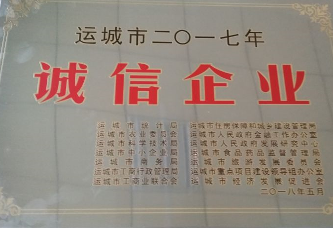 山西運(yùn)城綠康實(shí)業(yè)有限公司榮獲“運(yùn)城市二零一七年度誠信企業(yè)‘’榮譽(yù)稱號(hào)